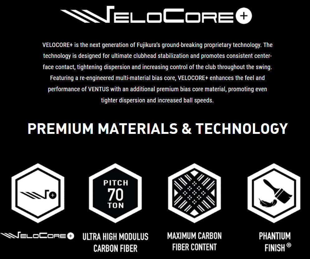 VELOCORE+ is the next generation of Fujikura’s ground-breaking proprietary technology. The technology is designed for ultimate clubhead stabilization and promotes consistent center-face contact, tightening dispersion and increasing control of the club throughout the swing. Featuring a re-engineered multi-material bias core, VELOCORE+ enhances the feel and performance of VENTUS with an additional premium bias core material, promoting even tighter dispersion and increased ball speeds
