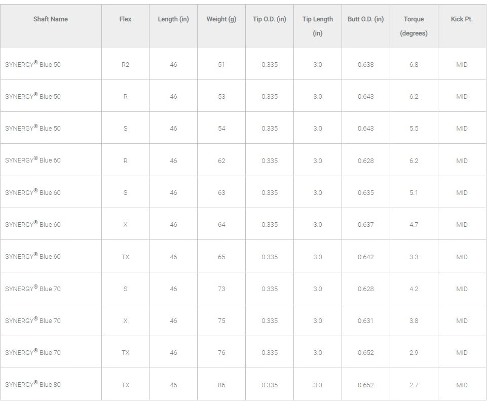 ALDILA® SYNERGY® Blue shaft delivers unparalleled stability in a smooth, balance profile through the synergy of Graphitic Carbon Fiber and nanoscopic Graphene platelets. In its purest state, Graphene is up to 300 times stronger than structural steel, and one of the thinnest and lightest materials known to man. These properties are what make it an ideal component of the Graphene Infused Resin used strengthen the tip section of ALDILA® SYNERGY® Blue shafts. With an exceptional feel and a smooth, controlled release these shafts offer premium performance at a surprisingly attractive price. Designed with a high-end Ion Plating Technology finish for a vibrant look that matches their thoroughly modern design.
