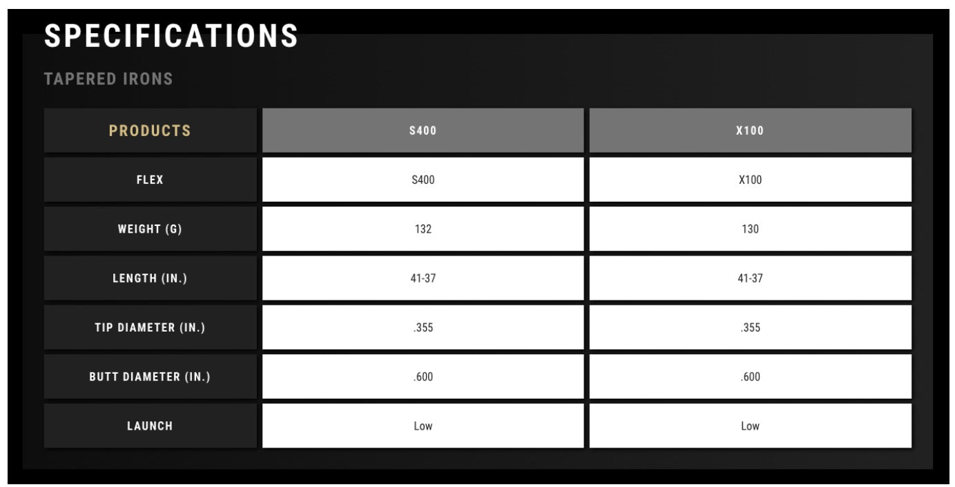 S400, Stiff Flex, Weight 132g, .355" Taper, Low Flight, Mid Spin.