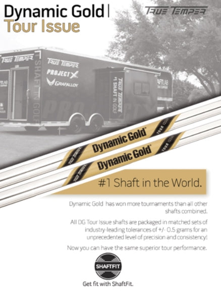 Dynamic Gold Tour Issue shafts provide similar power, control and the trademark penetrating ball flight associated with the entire series of Dynamic Gold irons. The Tour Issue shafts have a Tour Only weight tolerance of +/- .5 grams for custom precision fitting. The shafts are available in sets of 3-PW or 4-PW and in S400 and X100 flexes, .355" Taper Tip only