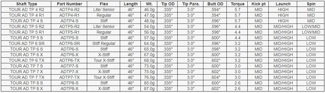 The new Tour AD TP shaft has a medium stiffness starting at the handle thru the mid-section of the shaft and a stiff tip profile to promote a mid/high launch condition and low spin. The new Tour AD TP also utilizes the latest in graphite material from Toray Industries, Inc., TORAYCA ® T1100G carbon-fiber pre-preg with NANOALLOY ® technology in the tip section of the shaft for additional shaft stability, exceptional feel and precise ball control.