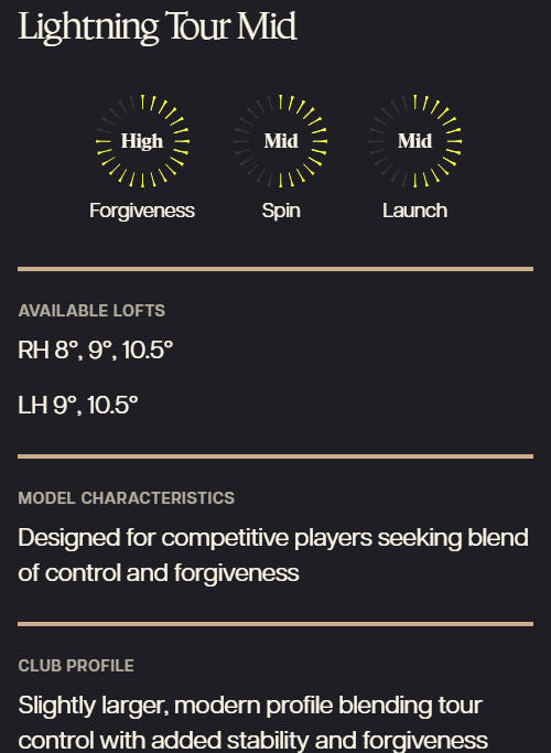 Higher Strength-to-Weight Ratio: A thin-wall carbon fiber crown and sole enable precise mass placement for optimized CG and launch conditions. Up to 84% more carbon in the Lightning chassis produces higher MOI, improved stability, and maximum forgiveness across all four head designs.