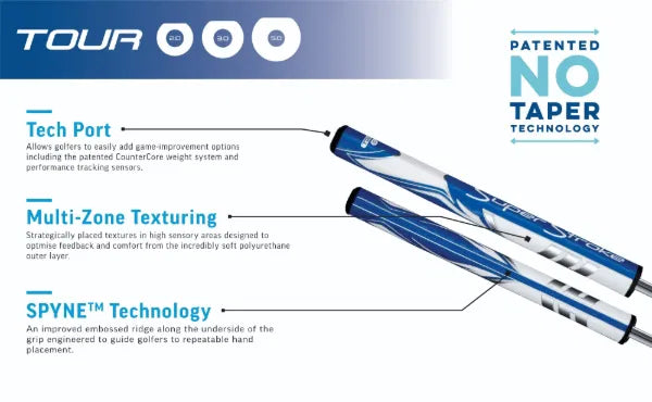 Tour Series putter grips feature SuperStroke's traditional and most popular putter grip profile. The Tour Series parallel design has uniform lower hand profile to minimize grip pressure and maintain putter head path for a more consistent stroke.