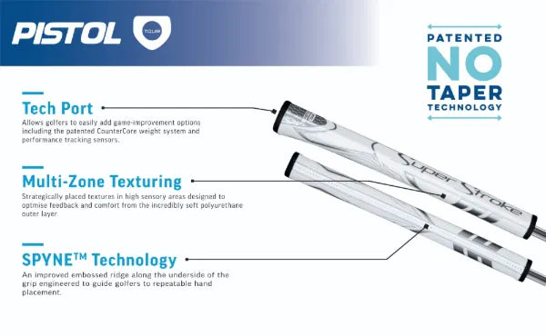 The Pistol series is a modern take on a beloved classic. These putter grips merge a pistol-style top section that helps golfers lock in their upper hand position with “No Taper Technology” to help golfers maintain even grip pressure and boost the consistency of their stroke.